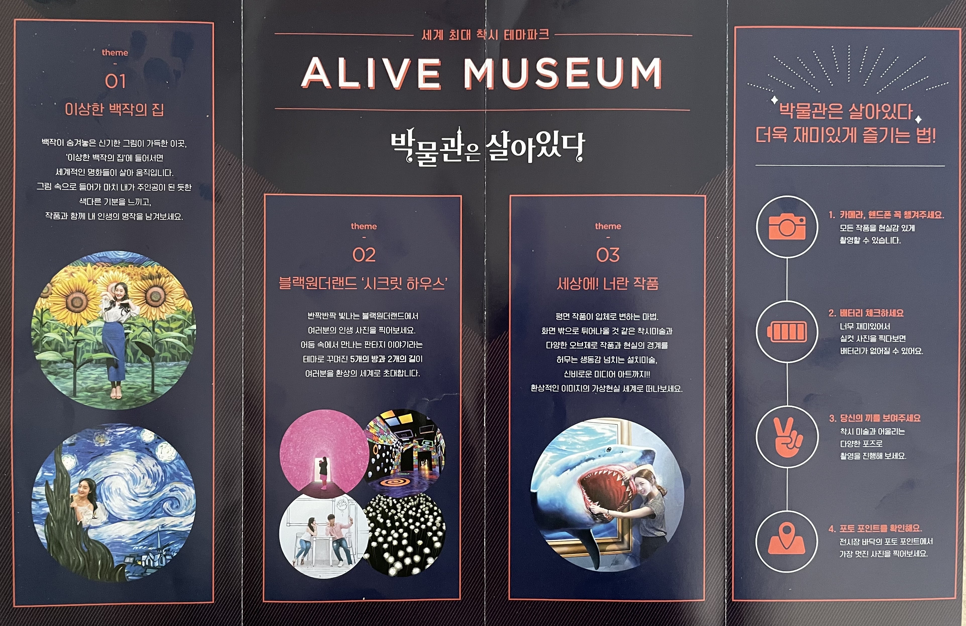 박물관은 살아있다는 최고의 트릭아트전 전시라고 할 수 있습니다. 평면작품에 내가 주인공이 되어 입체적으로 살아나는 흥미로운 경험을 하게 될 것입니다. 사진 촬영에 비협조적이던 아이도 이곳에 오면 사진을 백 장쯤 찍어도 즐거워할 만한 장소입니다.