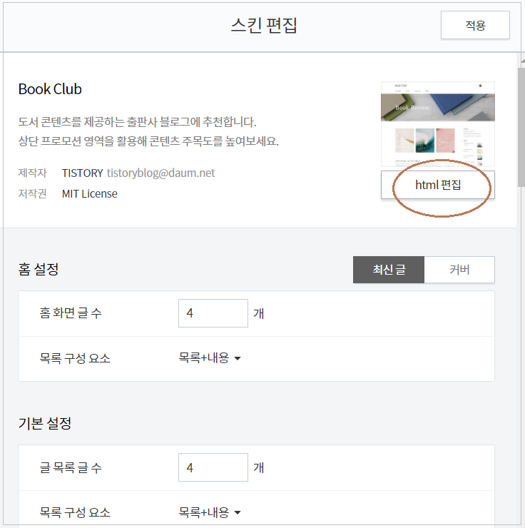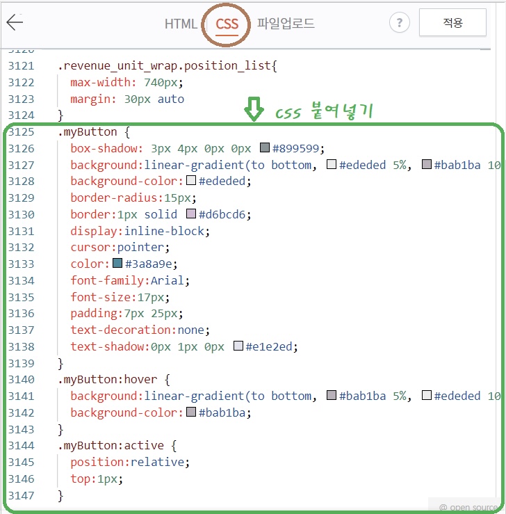 CSS 코드(초록 박스)는 블로그 관리→ 스킨 편집→html 편집→CSS에서 맨 마지막에 Button Generator에서 생성된 코드를 붙여 넣기 해준후 적용을 눌러줍니다.