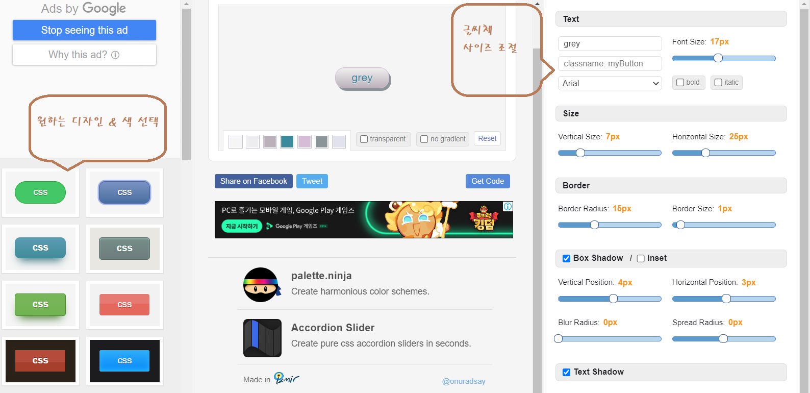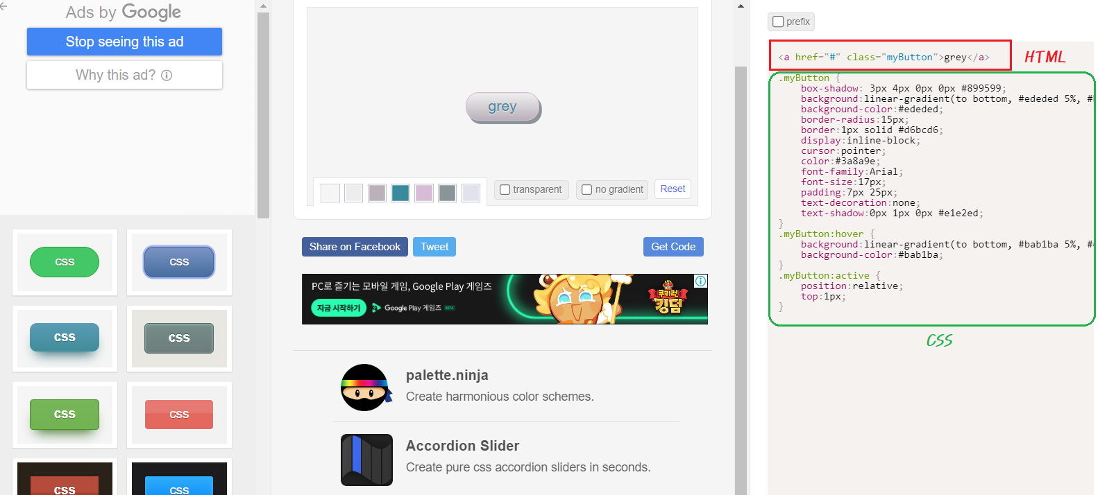 Button Generator사이트에서 원하는 디자인과 색,글씨체와 사이즈 등을 원하는 대로 수정한 뒤 코드를 가져온 뒤 버튼 생성기 중간에 Get code를 클릭해서 코드를 확인합니다.