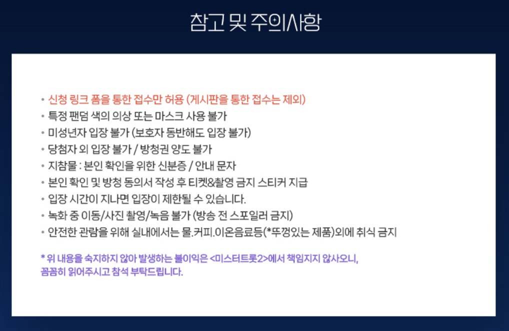 미스터트롯 2 방청권에 당첨되신다면 너무 행복한 시간이 될 것 같습니다. 더불어 주의사항도 한 번씩 숙지하시면 좋을 것 같습니다.