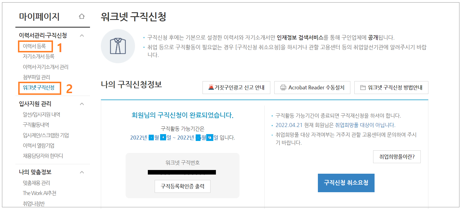 워크넷 가입 후 구직신청을 꼭 하셔야 합니다.