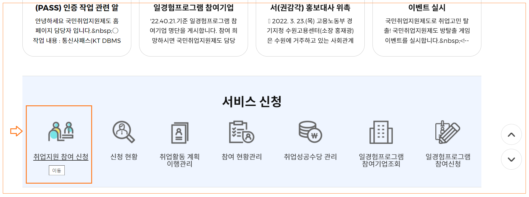 아래쪽으로 쭉 내려보면 취업지원 참여 신청이 있는데 이 부분 클릭해주세요.