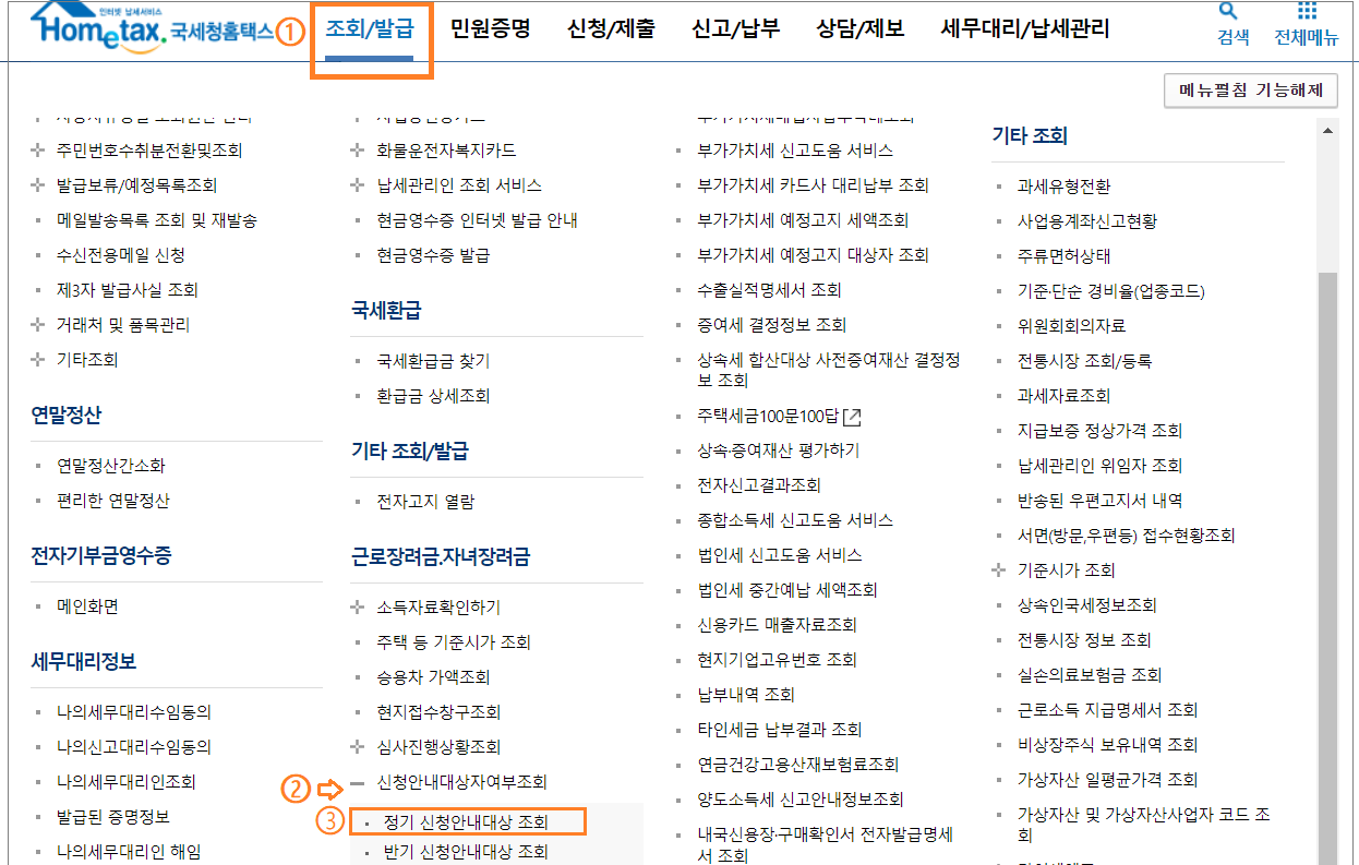 -> 신청 안내 대상자 여부 조회-> 정기신청 안내대 상조회
