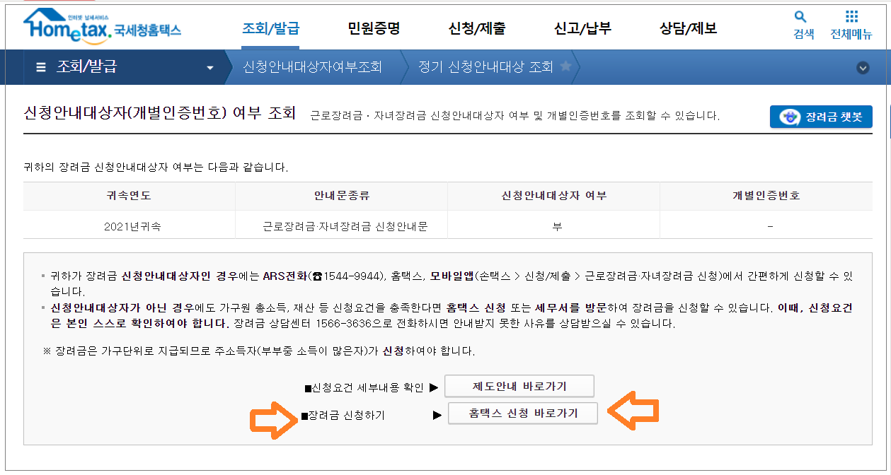 국세청 홈택스 -조회/발급-> 근로장려금, 자녀장려금