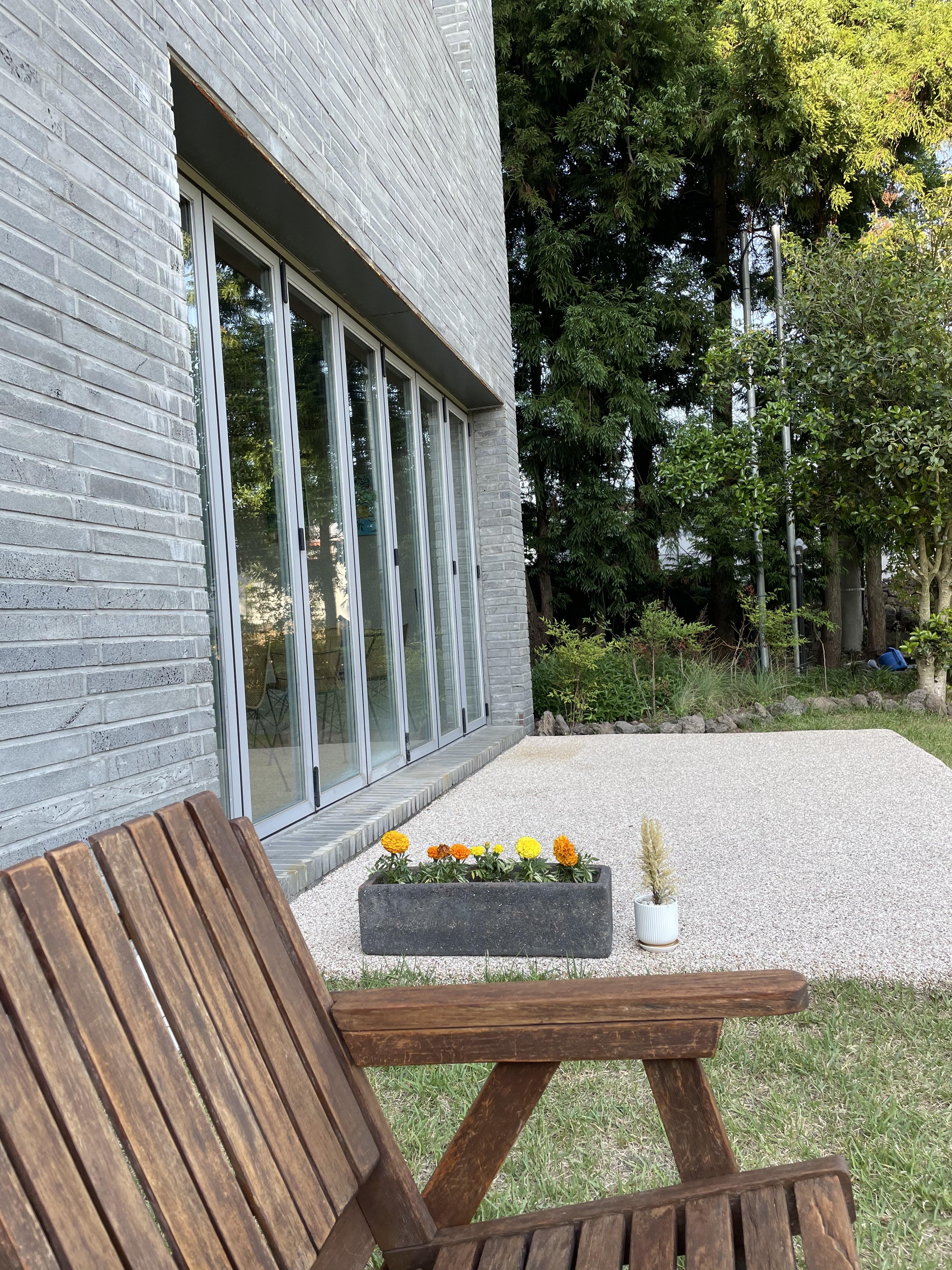 2층 테라스로 나가서 깔끔하게 정리된 1층 정원도 감상했습니다.
