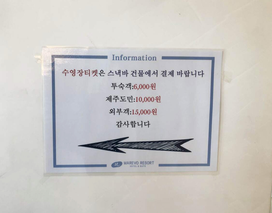 제주도엔 폭염특보가 발효된 가운데 방학을 맞은 아이와 갈만한 곳은 실내공간뿐네요. 집에만 있기도 힘든 상황이고 어디라도 가자 생각하던 중 수영장은 어떨까 하고 아이에게 물었더니 무조건 좋다고 합니다. 그래서 근처 몇 군데 수영장을 찾아보았어요. 그중 리뷰도 괜찮고 가까운 마레보 리조트 수영장에 가기로 했습니다.제주도엔 여름휴가로 인해 어딜가나 사람이 많을 것으로 예상되지만 투숙객이 아니어도 수영장만 이용할수 있고 도민할인이라는 매력적인 선택지가 있어서 서둘러 보았습니다.