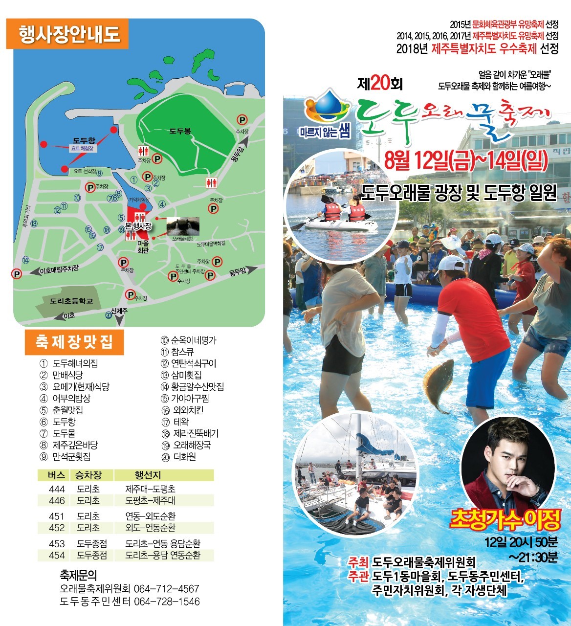| ●일 시 : 2022. 8. 12(금) ~ 8. 14(일)/3일간 ●개최장소 : 오래물광장 및 도두항 일원 ●주관/주최 : 도두1동마을회, 각 자생단체/도두오래물축제위원회 ●행사내용 : 개막식, 체험프로그램 등 |