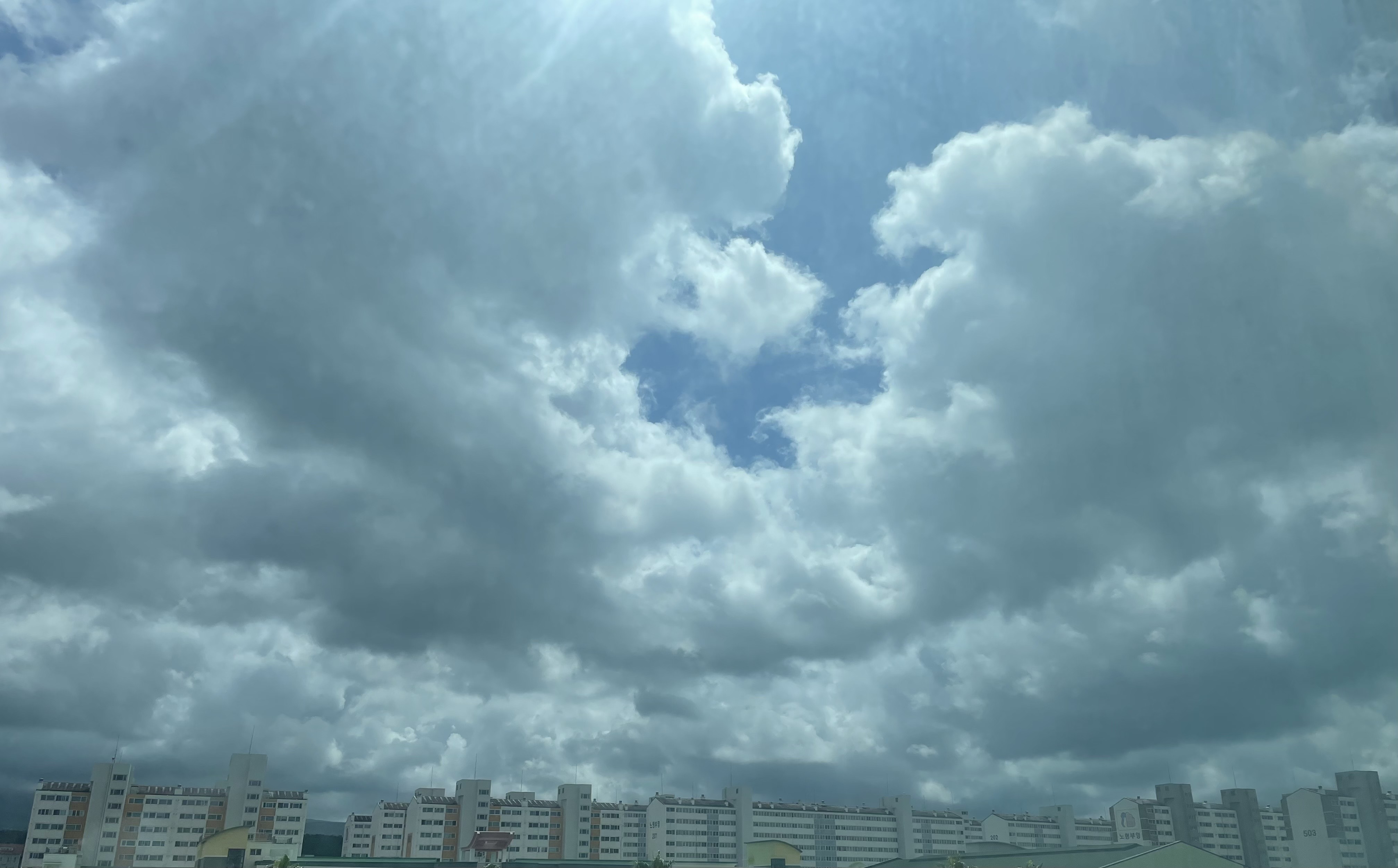 열심히 지우고 나니 유리창 바깥쪽에 비가 왔던 흔적과 더불어 파란하늘도 조금씩 보이고 있네요.