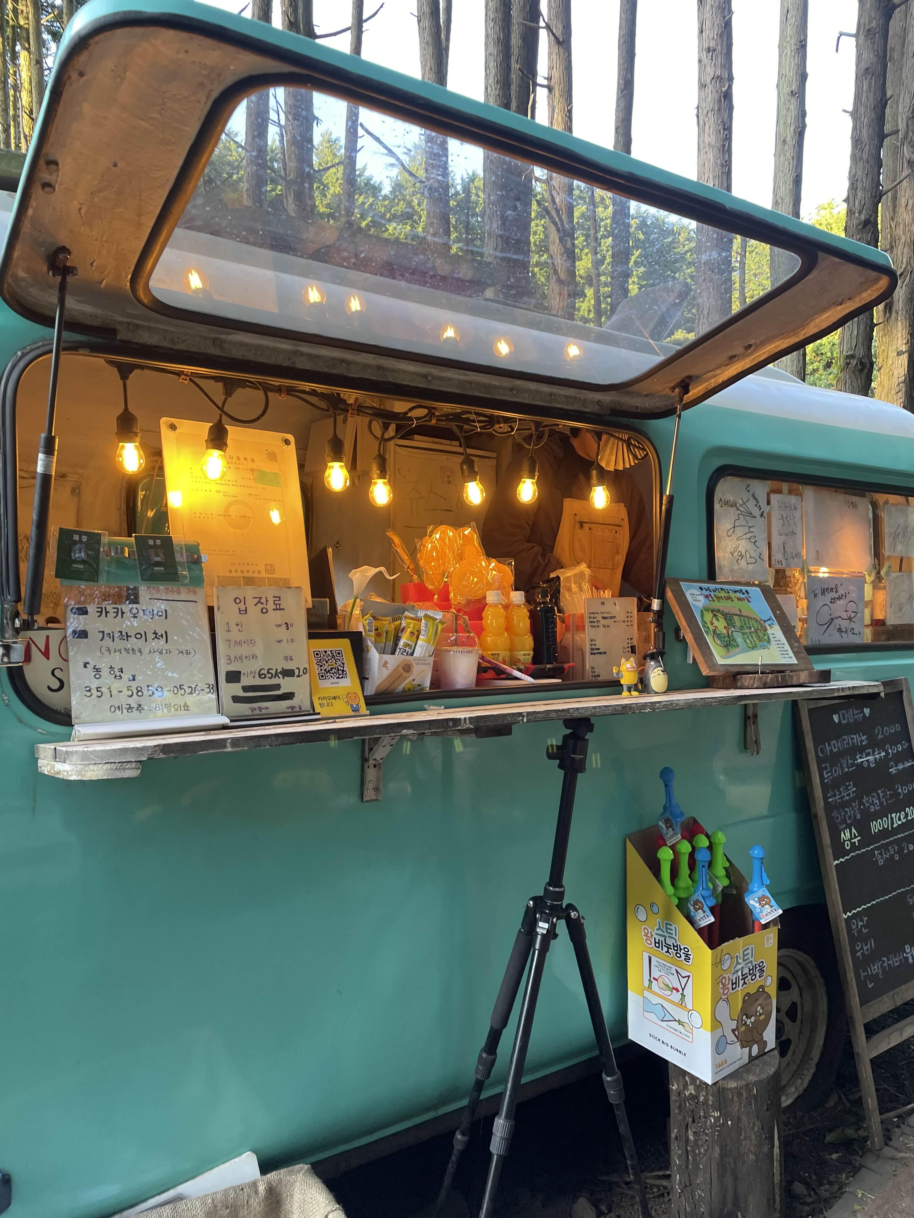 비밀의 숲 입구는 주차장 중간쯤에 있어요 민트색 푸드트럭이 보이는데 이곳이 매표소 겸 카페입니다. 카드결제 가능합니다. 간단한 음료도 구입 가능해요.