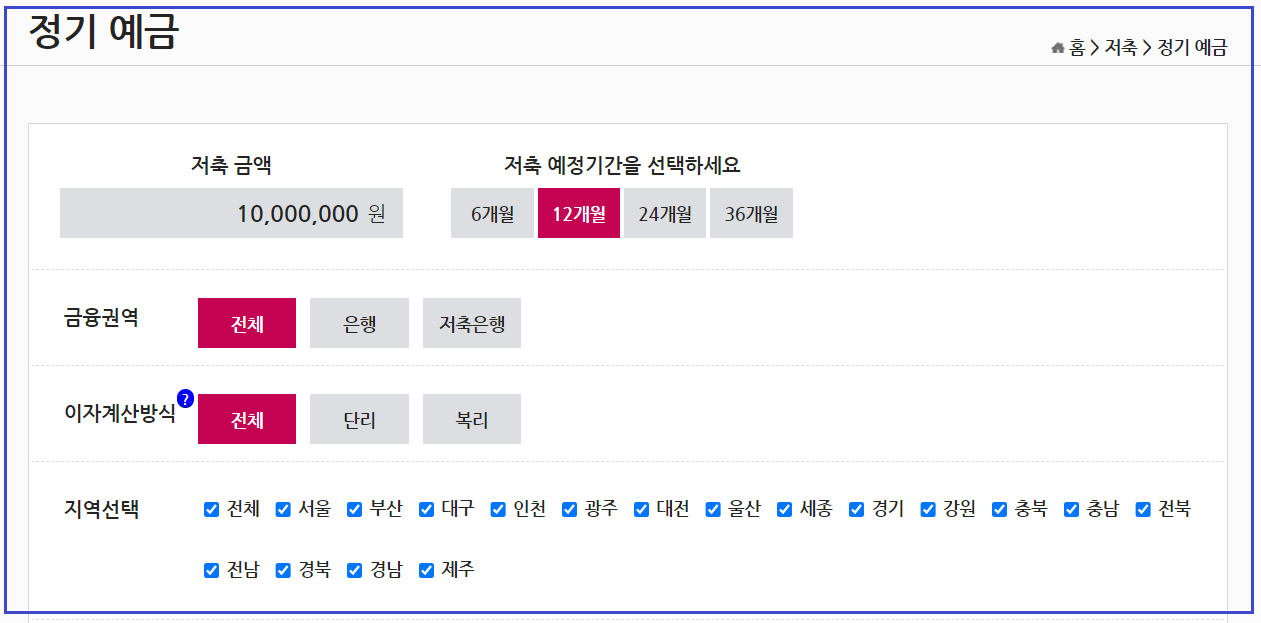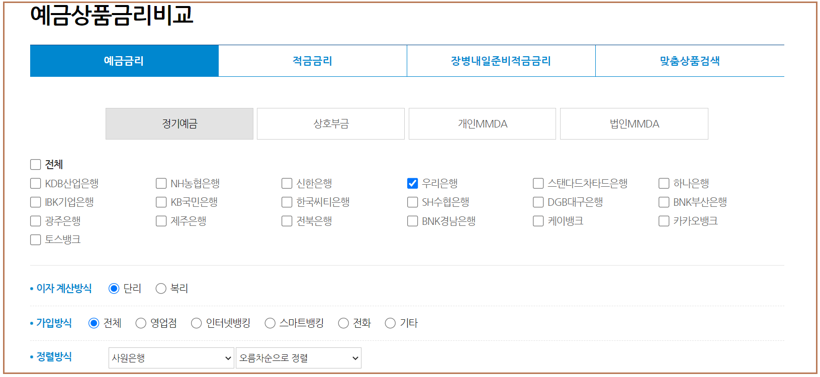 원하는 은행 한군데를 정해서 예금금리 비교도 가능하고 여러 은행을 설정해서 한눈에 비교해 보는 것도 가능합니다.