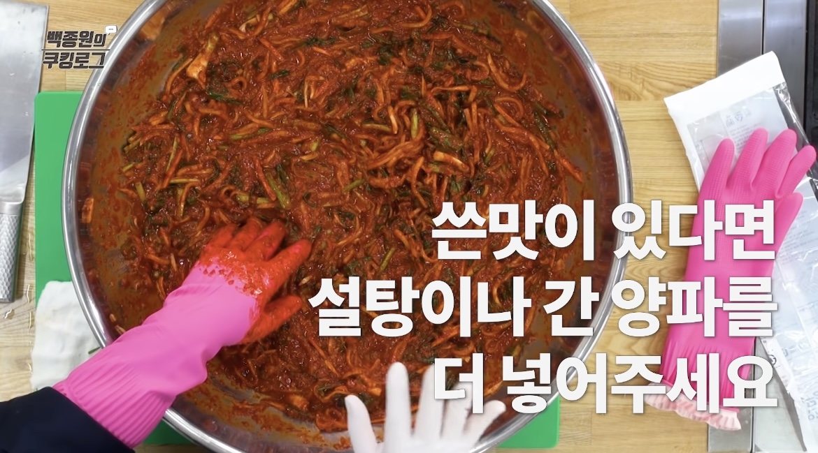 6. 김칫소 재료를 다 섞은 후에 골고루 버무려 준 뒤 쓴맛이 나는 경우에는 설탕이나 간 양파를 더 넣어서 쓴맛을 완화해주세요.