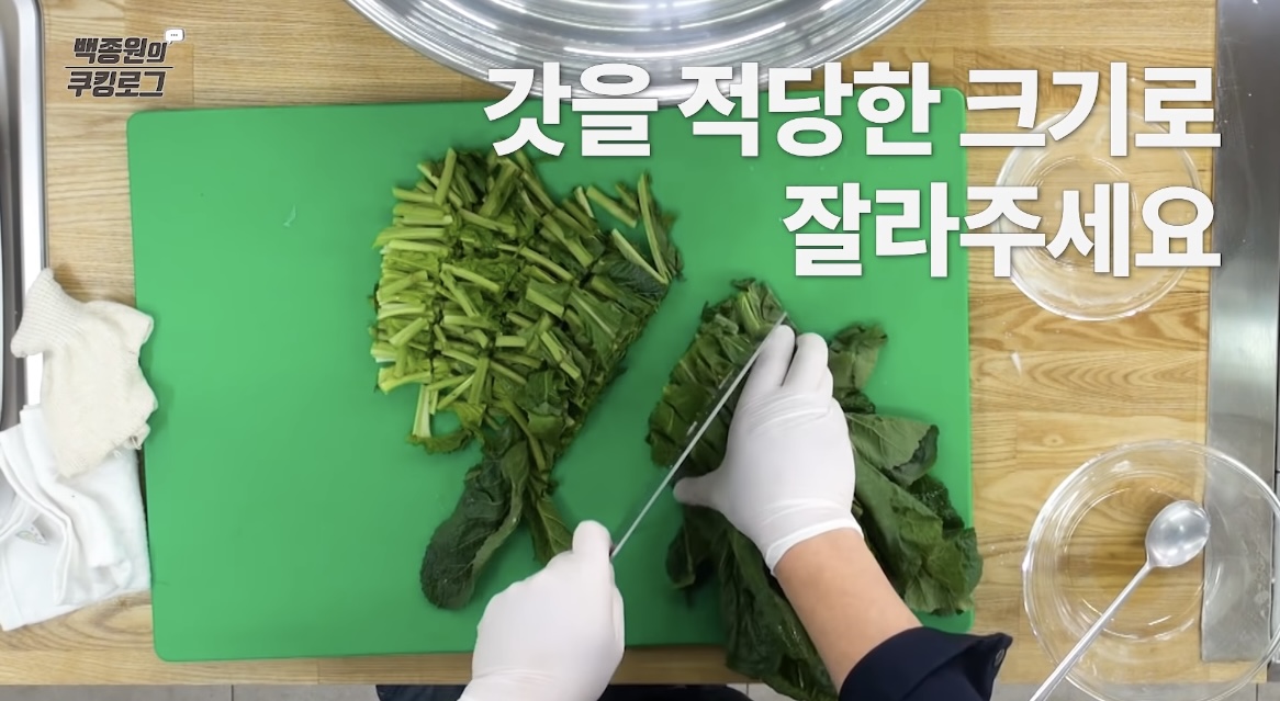 갓은 뿌리를 자른 후 줄기 3cm, 이파리 2cm 길이로 잘라줍니다(갓이 없을 경우 무청이나 미나리로 대체 가능합니다) 무청, 쪽파는 3cm 정도로 잘라줍니다. 취향에 따라 당근을 넣으셔도 되는데 먹을 때 입에 걸리는 게 불편하시면 안 넣으시는 게 좋습니다.