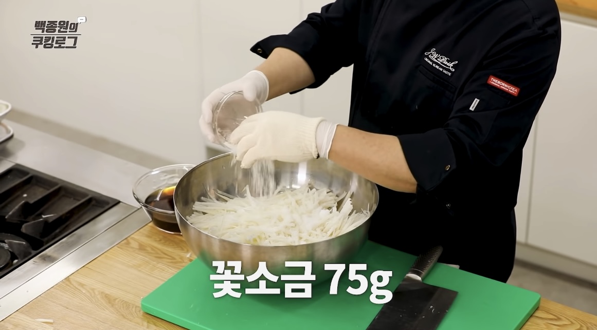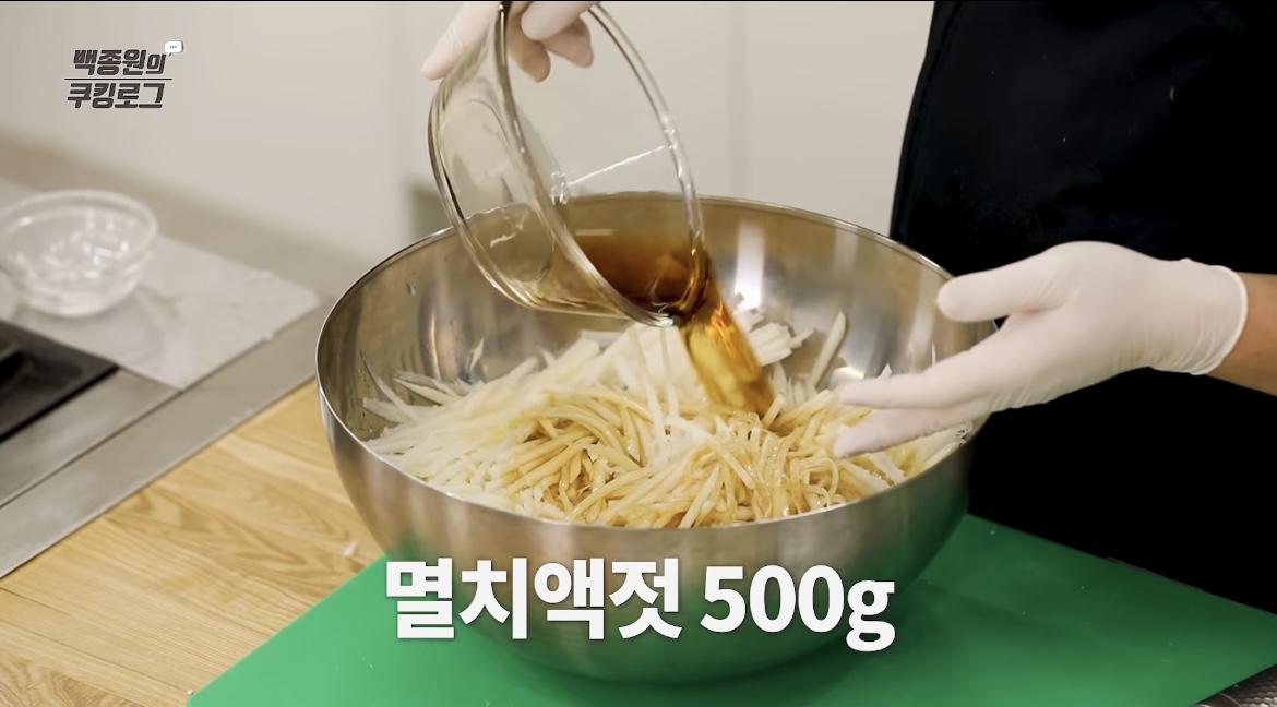 2. 무는 채칼로 썰어 줍니다.(채칼 사용 시 꼭 목장갑은 필수입니다) 너무 길게 자르면 엉키기 때문에 적당한 크기로 자르는 게 좋습니다. 채 썬 무에 꽃소금 75g, 멸치액젓 500, 새우젓 350, 멸치액젓 500g를 넣어 절여줍니다. 무가 휘어질 정도로 절여주세요. 젓갈은 원하는 취향대로 넣으셔도 됩니다.(명란젓 제외)
