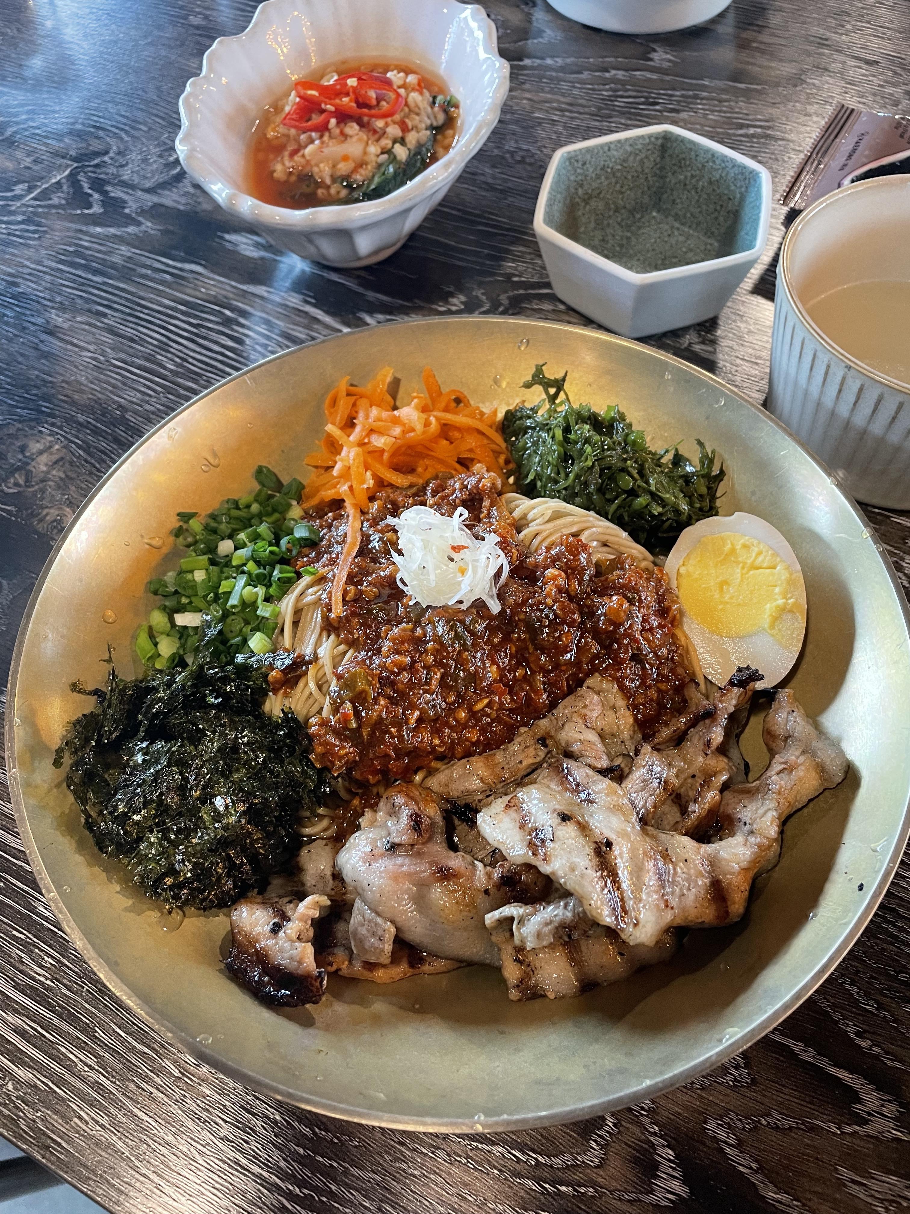 저희는 제주 고기국수와 제주 비빔국수세트 메뉴를 시켰어요.비쥬얼은 깔끔하고 푸짐한 느낌입니다. 비빔국수는 세팅되어 있는 식초를 한 바퀴 돌려서 비빕니다. 고기국수는 국물이 진하고 고기 냄새는 없었어요. 그리고 무엇보다 고기양이 정말 많았어요. 세트 메뉴로 시켜서 거의 고기 파티 수준입니다. 고기는 불맛이 그대로 살아있어요. 열심히 먹다 보니 약간의 느끼함이 몰려오는데 열무김치가 같이 나오는 이유를 알 것 같았어요. 통보리 열무김치가 정말 시원하고 맛있어서 고기국수와 궁합이 좋았습니다.