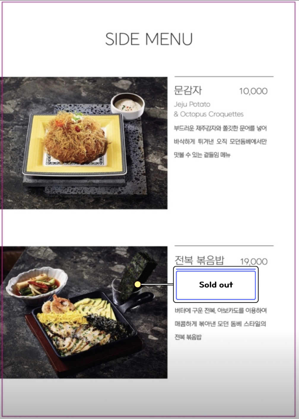 전복 볶음밥은 메뉴판에 sold out으로 표시되어있는데 현재는 판매하고 있지 않은 듯합니다.